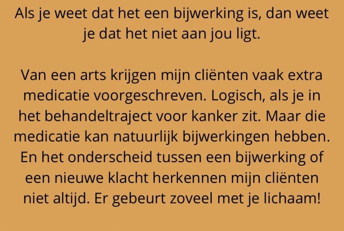 Van een arts krijgen mijn cliënten vaak extra medicatie voorgeschreven. Logisch, als je in het behandeltraject voor kanker zit. Maar die medicatie kan natuurlijk bijwerkingen hebben. En het onderscheid tussen een bijwerking of een nieuwe klacht herkennen mijn cliënten niet altijd. Er gebeurt zoveel met je lichaam!